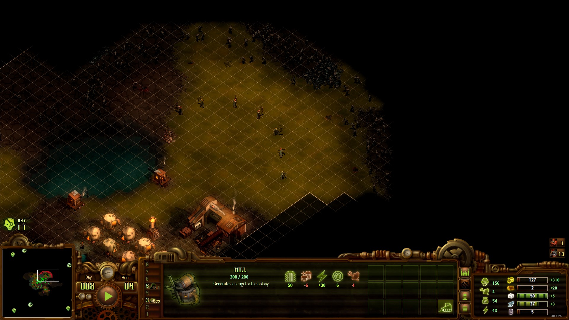 Thanks to the manual save trick, playing on the hardest difficulty becomes thoroughly satisfying, and the ability to save comes in particularly handy when playing hero missions during the Campaign, where a misclick can kill the hero and void the last 45+ minutes of gameplay. If endured, the highest difficulty will let you experiment on enormous swarms of zombies and enjoy your experiments rather than see them as a rage-inducing exercise in tedium. Whatever you choose, I recommend against playing on the lowest difficulty. It gives you ample time to set up a colony, but you are likely to explore the level very quickly, kill off all zombies, build the base, and get bored out of your mind waiting for the paltry zombie wave to finish the level.