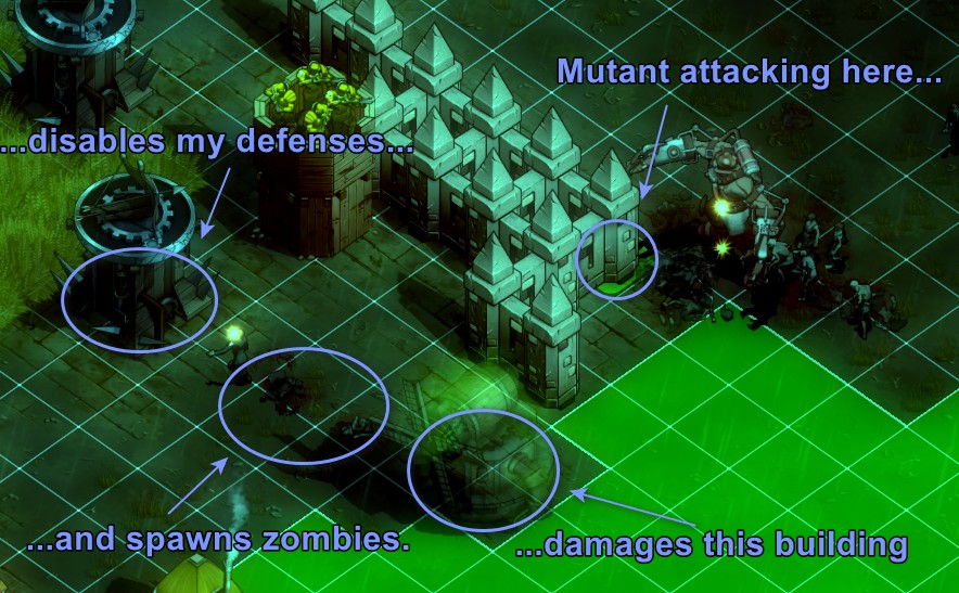 A thoroughly demented example of this problem comes courtesy of the Infected Mutant, a special zombie type who does low AoE damage that splashes to nearby tiles but attacks very quickly. When you see him heading to your base, you better be ready to instantly kill him or you'll suffer. In some circumstances, his attacks can splash way beyond what I would expect and hit buildings he shouldn't be able to. In the following image, you can see a situation where that happens and in which I thought I was ready for him, but his attacks immediately depowered my defenses because he infected a Mill way beyond his AoE range (click the image for the 169 KB, 884x547 JPG version).