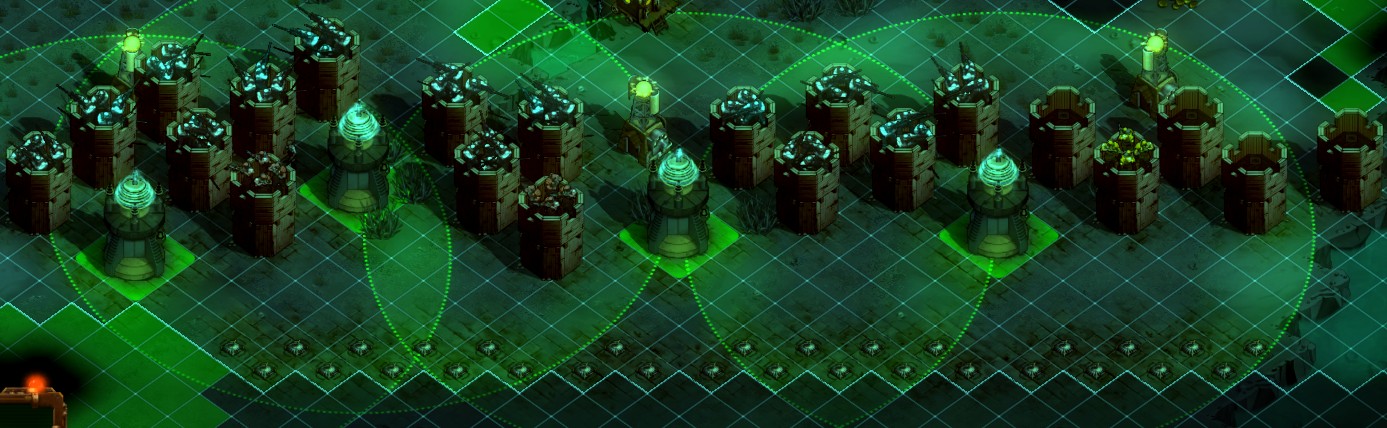 In another stellar example of lackadaisical video game development, They Are Billions lets you build and man towers but doesn't explain how to do it properly. You can place the three units you make in a Soldiers Center in towers to massively increase their attack and sight ranges. A Sniper, who by default has the attack range of 8 tiles, covers an area of r²π = 64π. Place him in a Wood Tower that adds 3 tiles to his range, and he now covers 121π, nearly doubling his coverage. Place him in a Stone Tower for a 4-tile range boost, and he covers an area of 144π! The problem is that both Wood and Stone Tower have a 1-tile spacing requirement, so you have to judiciously build them so that they support each other and minimize time-to-kill and wasted shots that generate needless noise.