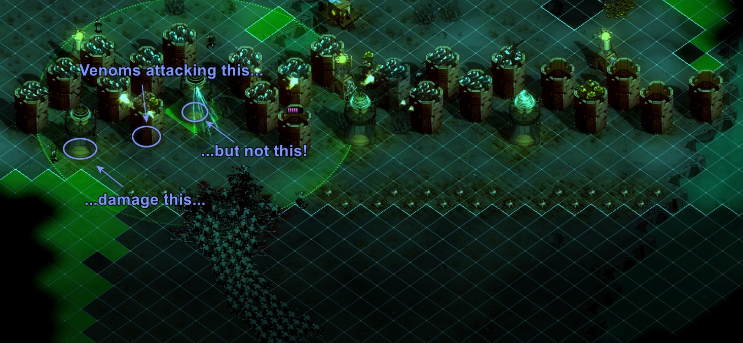 The above video shows the absurdity of the zombies' hard-coded hatred for Tesla Towers. This hulking monstrosity, the Infected Giant, can wipe out my defenses in an instant, and yet, he got so fixated on a Tesla Tower within his sight range but outside his reach that he couldn't stop moonwalking towards it in a vain attempt to reach it across unpathable terrain. You can't expand without placing Tesla Towers, so it's crucial to learn the size and shape of its energy field coverage and meticulously plan where and when to place it so that it is properly defended and that you can correctly expand, but now you also know that they are a magnet for zombies, especially when within their sight range, so you can exploit it by predicting their path to your base and distracting at least some of them with a decoy Tesla Tower. It is crucial that you defend your Tesla Towers, because zombies will take them out and that might spell doom for your mission if that Tesla Tower is powering your defenses. Note that the Giant in the above video was trying to reach the farther Tesla Tower rather than the infected one I had selected; zombies completely ignore infected buildings.