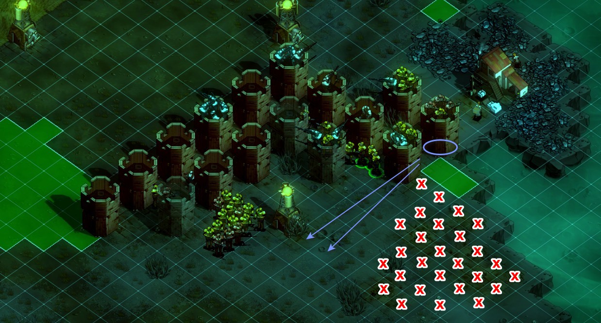 Though 144π area coverage sounds amazing, a huge problem is that, even though your units placed in towers are shown as high above the ground, and they might be able to see over certain tiles, they might not be able to shoot over them because of a line of sight mechanic that is not explained at all, and you will likely not even realize that some of your units aren't shooting at anything until you've been playing the game for some 500 hours. Figuring out lines of sight is so important that, when I uncover any portion of the map in They Are Billions, I first identify which tiles give my units unobstructed line of sight of the path the zombies will take, then I figure out where to place my towers so that that path is under the most optimal damage distribution, and then I build my base in reverse to achieve that. Here's an approximation of what Soldiers in a Wood Tower can (blue lines) and can't shoot at (red Xs) (click the image for the 252 KB, 1,238x666 JPG version):