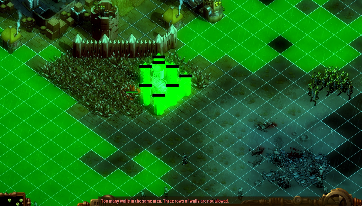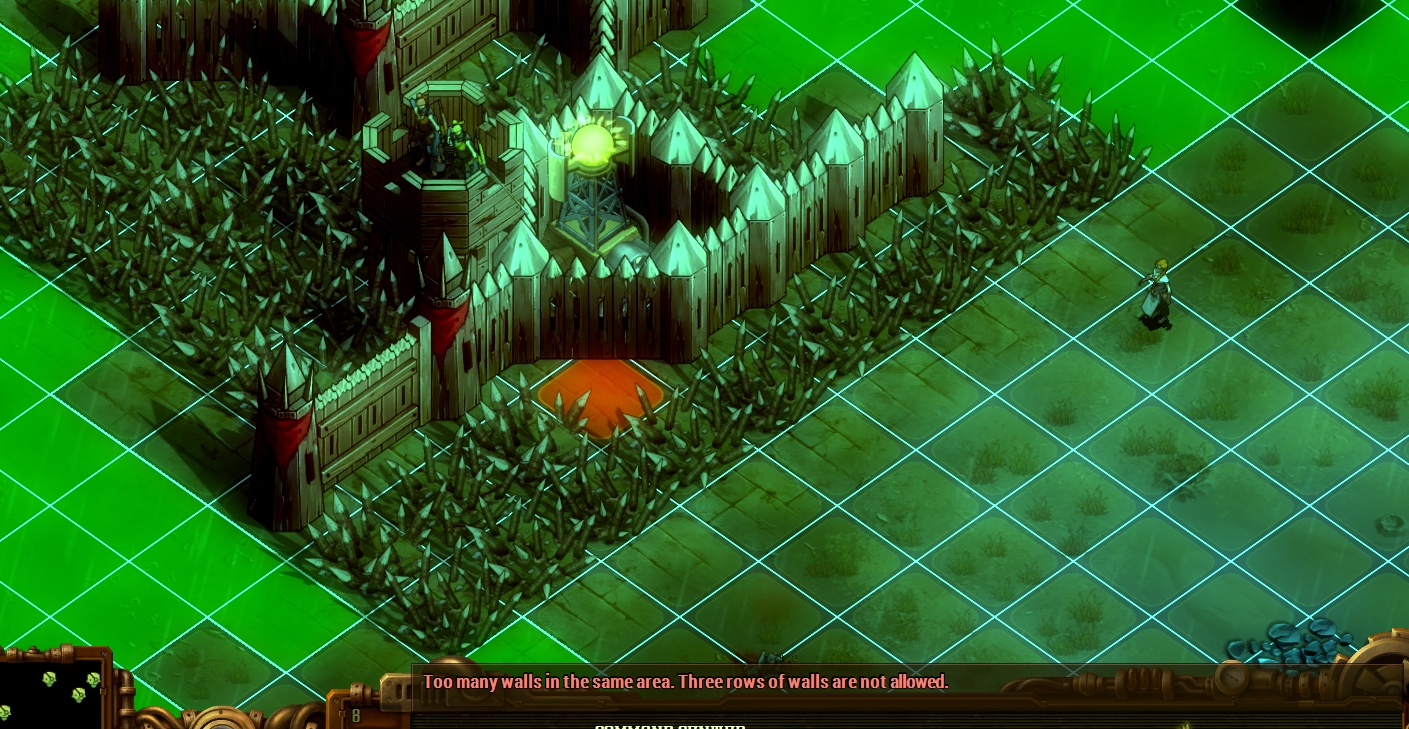 They Are Billions plays perfectly fine during the real-time strategy part, and I don't have any issues with how it plays during the turn-based strategy part, but it's during the tower defense part that I guarantee you'll lose your fucking mind. I've uninstalled the game in frothing rage at least a hundred times because of how shittily the tower defense part is designed and how unpredictable it is. Just to give you an example, the developer hard-coded a restriction that you can't stack more than three layers of walls, but what constitutes a wall is not always clear, and what constitutes a layer isn't always known, and the game apparently considers wood towers and wood gates "walls." I've had instances where I couldn't place a wall because there was apparently a tower behind or a gate, or... (click the image for the 1.08 MB, 1489x846 JPG version)??